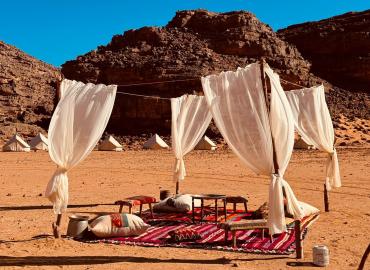 Admiration du coucher de soleil suivie d'une soirée animée autour d’un dîner sous les étoiles et nuitée en bivouac au cœur du désert.