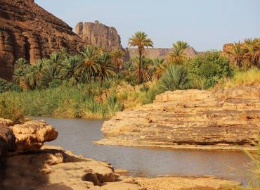 Randonnée matinale de 6 km dans le canyon verdoyant d’Essendilène, jusqu’à la guelta, havre de fraîcheur et de paix.