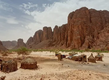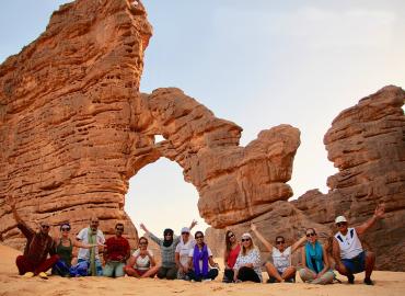 Pause déjeuner à TIKOUBAOUINE, puis découverte de TIKOBAOUINE au pied de la falaise du Tassili, où le vent a sculpté des formations rocheuses spectaculaires. Visite de de la GRANDE ARCHE et des peintures rupestres.